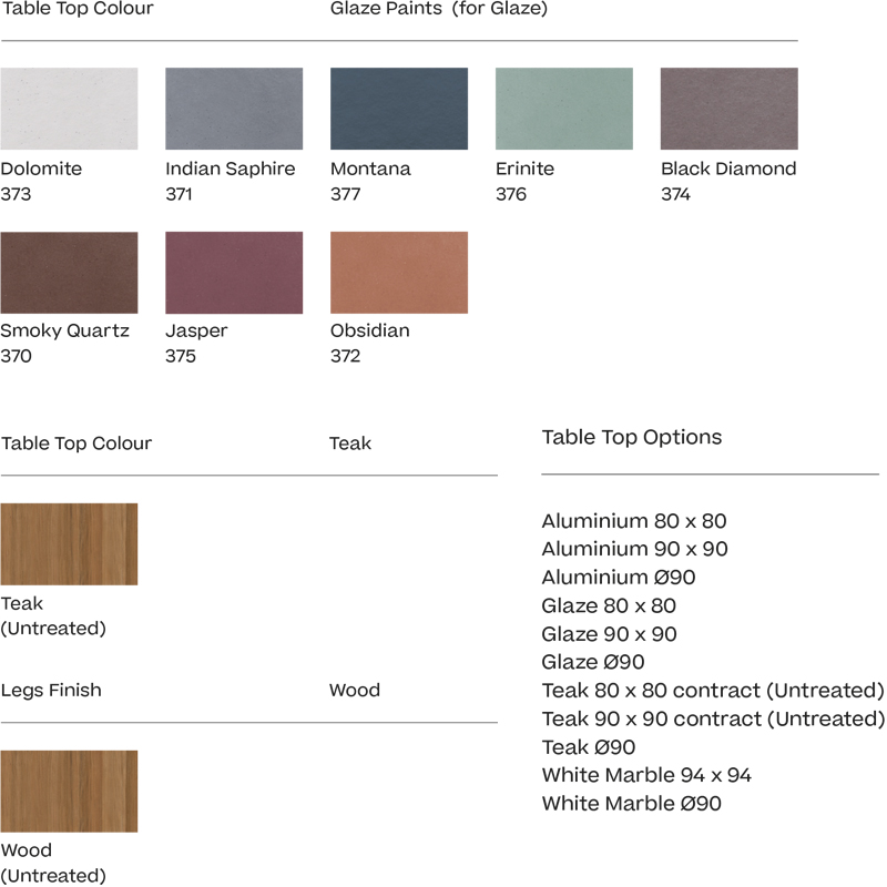 Dimensions : Ø 90 ; 90 x 90 ; 80 x 80 cm ; H 74 cm
