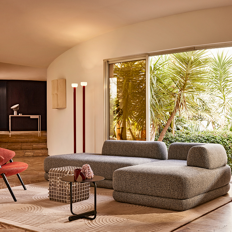 Détails : Canapés monoblocs et modulaires, pouf et coussin. Structure en bois. Assise, dossier et base revêtus de polyuréthane gradué/ Dacron Du Pont. Coussin en flocons de polyester régénéré et régénérable. Housse interne fixe en nylon ; en coton/polyester pour le coussin. Housse en tissu déhoussable. Il est construit sur trois niveaux de confort superposés - la base, l'assise et le dossier - qui déterminent le trait stylistique distinctif du design. Le dossier amovible est fixé au siège à l'aide de crochets empruntés à l'industrie automobile, qui ont également inspiré le nom du produit. L'assise est constituée d'un seul coussin généreux et profond, le dossier est bas et volumineux, en harmonie avec les accoudoirs, dessinant un profil incurvé et une forme enveloppante qui accueille et invite son utilisateur à s'asseoir et à se détendre. Designer : Calvi Brambilla