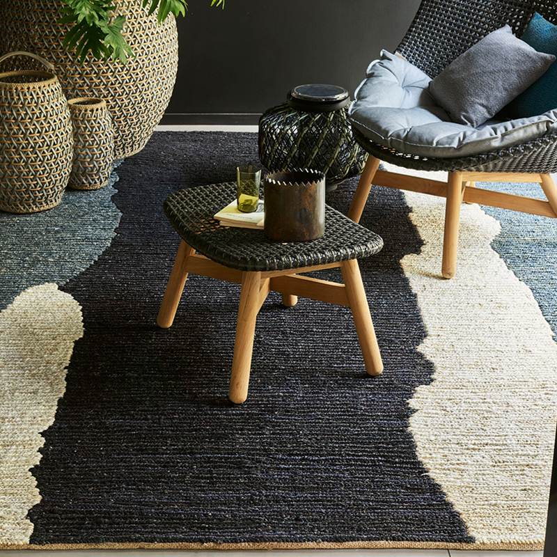 La composition libre de ce tapis est renforcée par le tissage Sumak, qui lui confère un caractère authentique et artisanal. Les tonalités très nature en font un accessoire original dans une mise en scène ethni-chic.