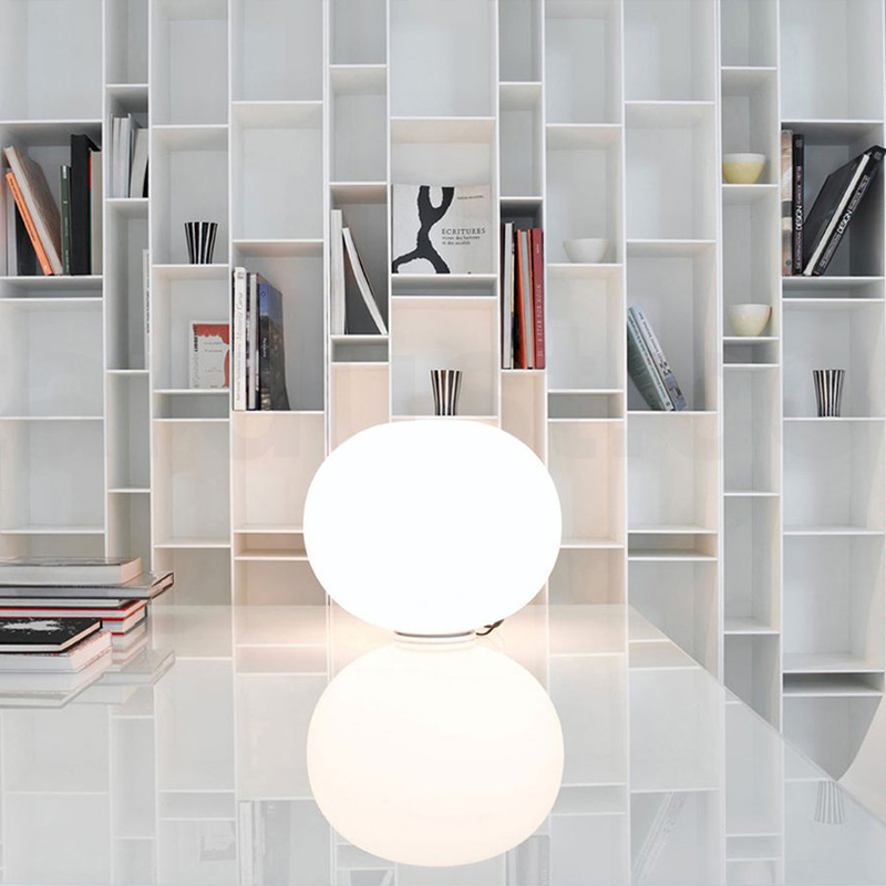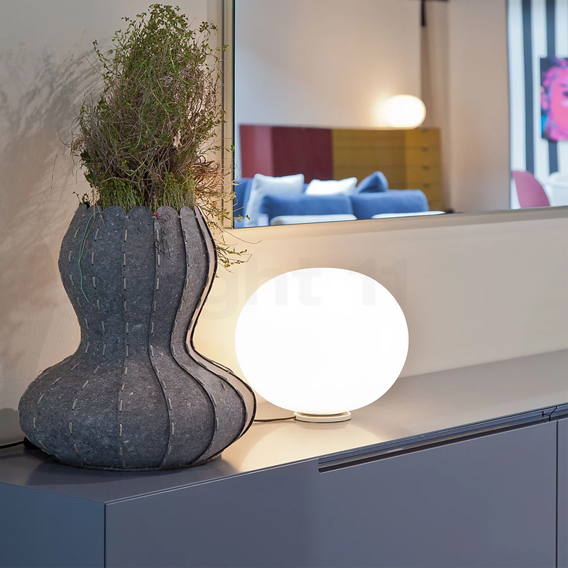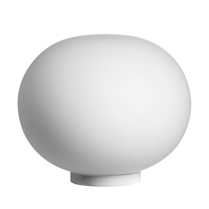 Détails : Lampe de table à lumière diffuse. Diffuseur en verre opalin gainé, soufflé à la bouche, acidifié. Attache filetée en aluminium moulé sous pression, finition galvanisé. Base composée d'un élément en polyamide renforcé par fibre de verre. Support de diffuseur en aluminium moulé sous pression, recouvert d'un vernis liquide coloris gris. Sur le câble il y a le variateur électronique qui permet de régler pas à pas l'intensité lumineuse. GLO-BALL BASIC ZERO : Ø 19 : max 60 W GLO-BALL BASIC 1 : Ø 33 : max 150 W GLO-BALL BASIC 2 : Ø 45 : max 150 W