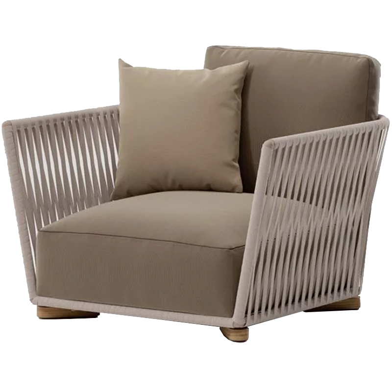 Détails : Grand Bitta est une collection chaleureuse et confortable qui combine des cadres en aluminium avec des cordes en polyester tressé, des plateaux de table en teck et en pierre. Designer : Rodolfo Dordoni