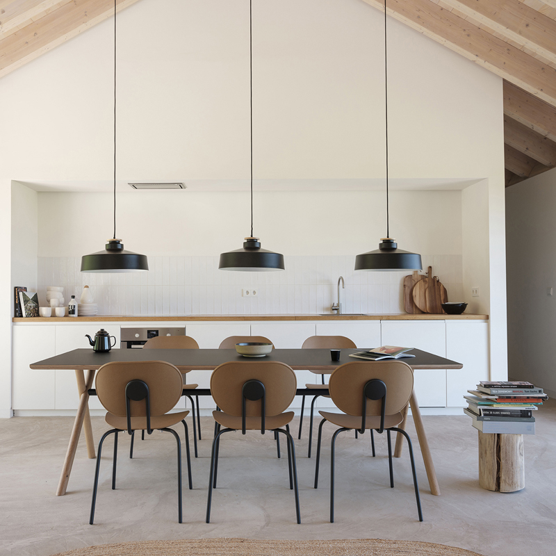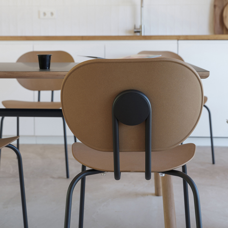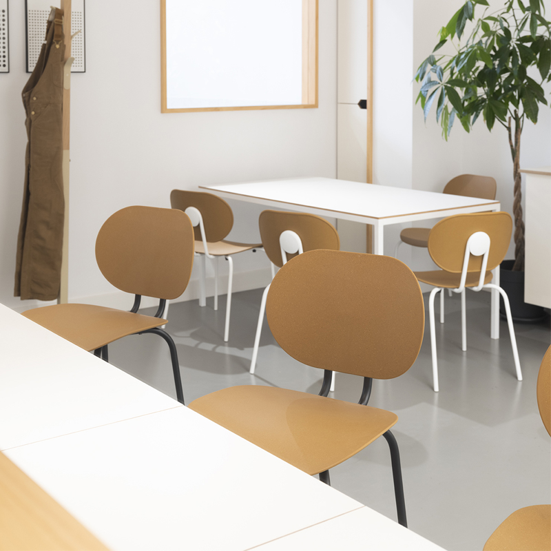 Détails : Chaise 4 pieds. Polypropylene bois ( disponible en blanc et caramel), un matériau innovant, qui mélange les restes et déchets issus des productions de meubles en bois. Empilable par 5.