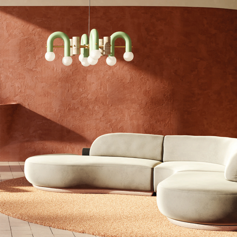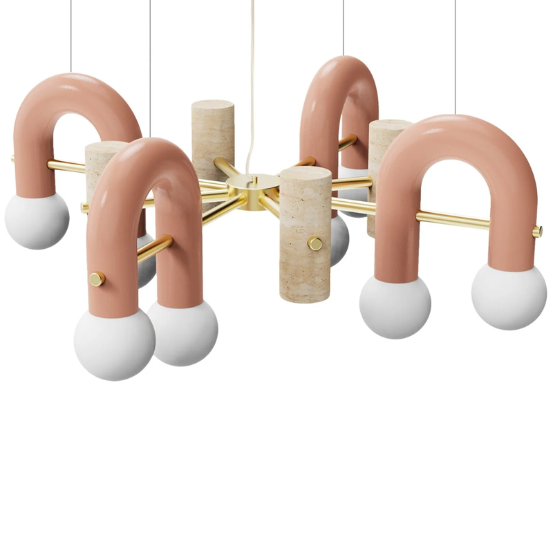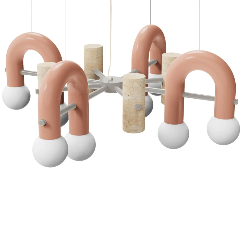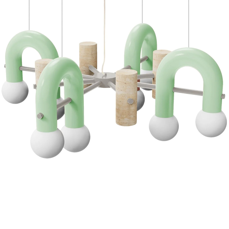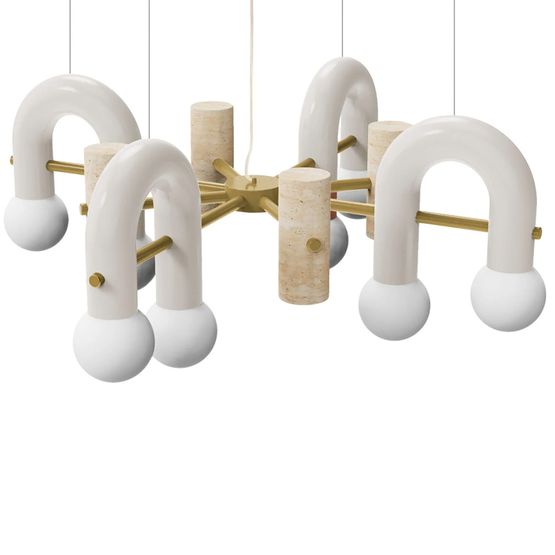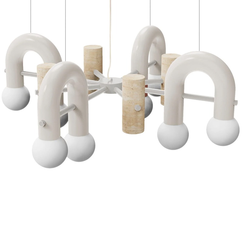 Détails : Structure : métal laqué, laiton/nickel Marbre travertin Tubes : métal laqué Cordon de 1,5 m en caoutchouc transparent Globes en verre dépoli Suspension à Led.