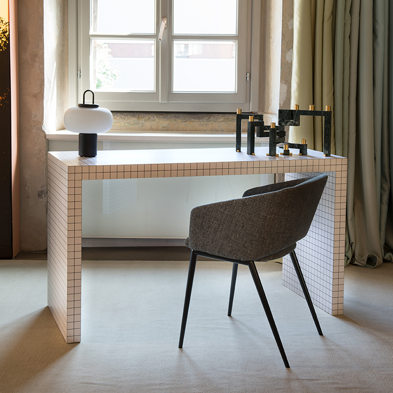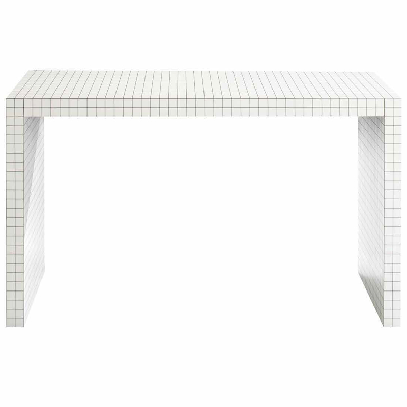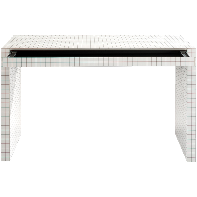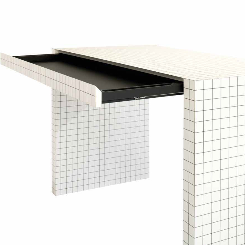 Détails : Structure en panneau alvéolaire plaqué en laminé Print, couleur blanche, imprimé en digital à carrés noirs avec entraxe de 3 cm. Tiroir rétractable obtenu dans l'épaisseur du dessus du plateau; compartiment intérieur du tiroir en bois verni gaufré noir résistant aux rayures. Design Superstudio - 1969-1972