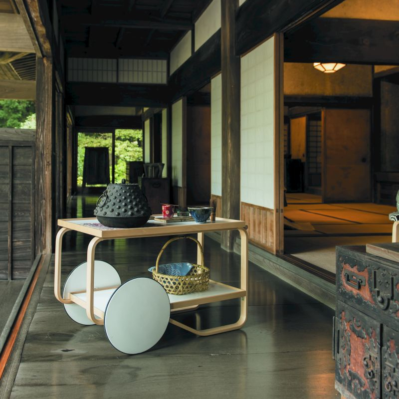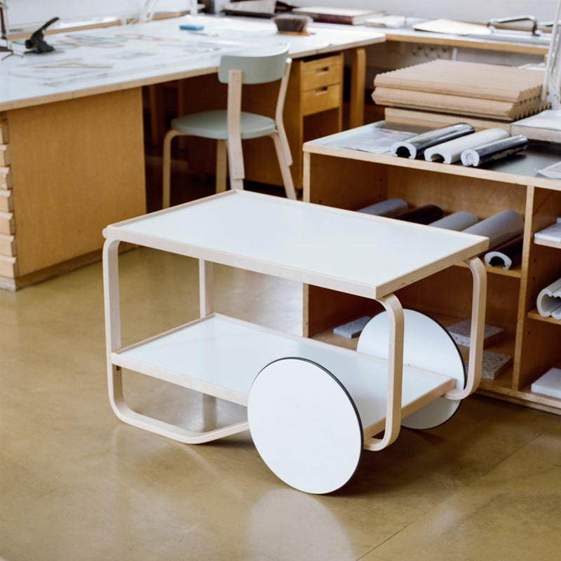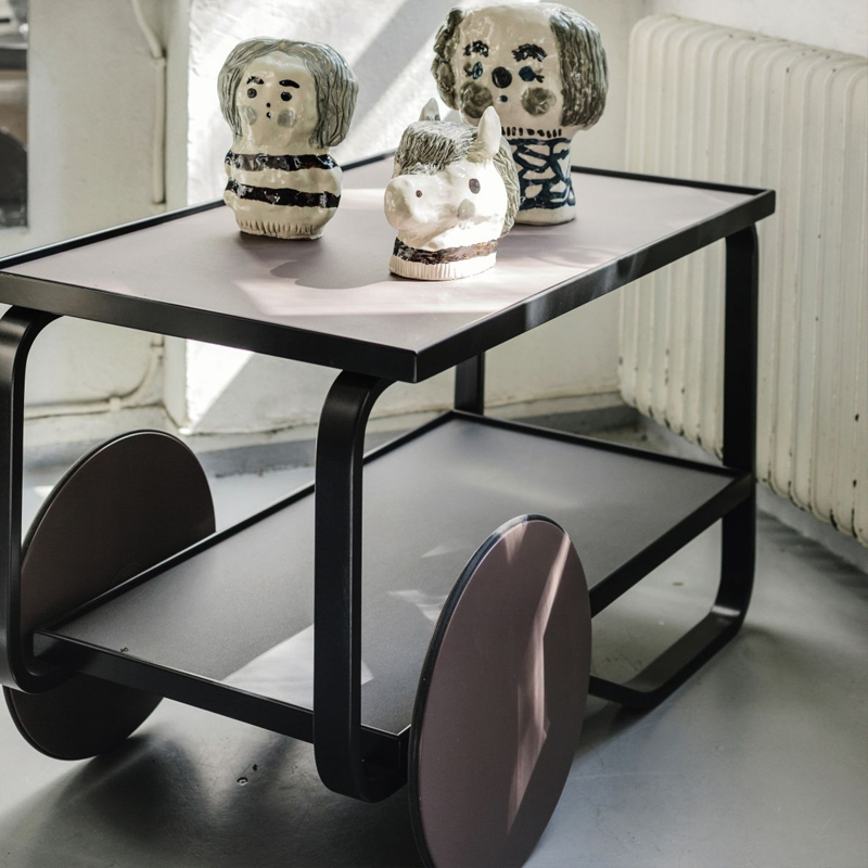 Détails : Le chariot à thé a été inspiré par la culture britannique du thé, qu'Aino et Alvar Aalto avaient appris à connaître au cours de leurs nombreux voyages, ainsi que par les boiseries et l'architecture japonaises qu'ils admiraient. Avec un cadre composé de deux boucles de lamelles de bouleau, le Tea Trolley 901 comporte deux étagères et une poignée en bouleau massif. Les roues jumelées, associées à la légèreté du bouleau, permettent de manœuvrer et de garer le chariot à volonté. Au fil des ans, de nombreuses variantes du chariot à thé ont été produites. La designer néerlandaise et experte en couleurs Hella Jongerius a fouillé dans les archives d'Artek pour proposer sa propre version de l'un des produits les plus appréciés d'Alvar Aalto. Ses interventions subtiles ont donné naissance à une version sombre du chariot, qui joue avec la lumière changeante des plateaux supérieurs et inférieurs du produit.