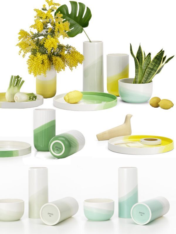 Colorés et lumineux, les plateaux et vases de la collection Herringbone Vessels viennent insuffler de la joie et de la gaité à nos tables ! Les plateaux et vases rainurés se déclinent dans deux couleurs affirmées : jaunes ou verts et, le vase lisse dans deux couleurs plus douces : menthe ou sable.